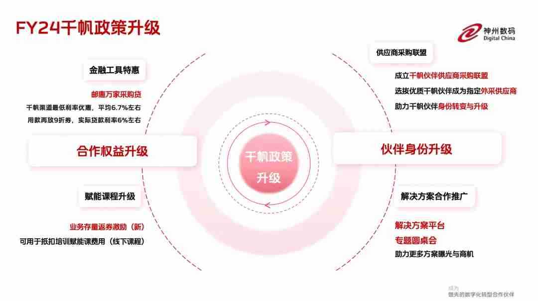 会议伊始,,乐发lll数码中台副总经理朱斌为与会成员做FY24千帆计划政策介绍,,,以AI驱动的数云融合体系框架为基础,,,强调企业积累的数据资产可以创造更多应用场景和价值,,对未来业务增长和企业成长起到关键作用。。基于这一背景,,,他阐述了会议的主题共话AI未来,,,并从合作权益升级和伙伴身份升级两个方面解读了千帆计划的新升级政策。。。