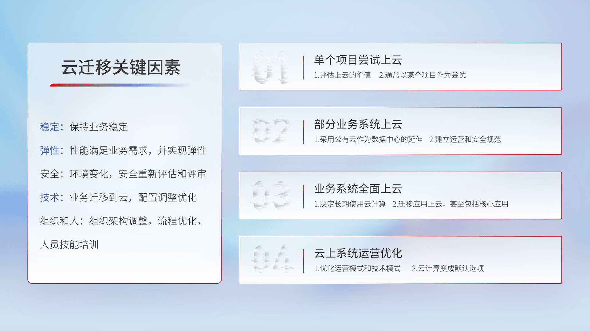 结合实际业务,,,,从规划设计、、、云平台选型、、、、云原生改造、、、、数据迁移、、、、集成交付,,,,迁移全过程为客户识别最佳上云路径,,做好风险识别管理,,设计网络架构、、、、身份权限、、、安全审计合规、、操作审计、、、日志审计、、、、监控告警策略、、、多站点容灾设计等,,,,对云上基础设施进行整体规划,,,,提升IT治理水平,,以满足弹性、、高可用、、、高性能的需求。。。