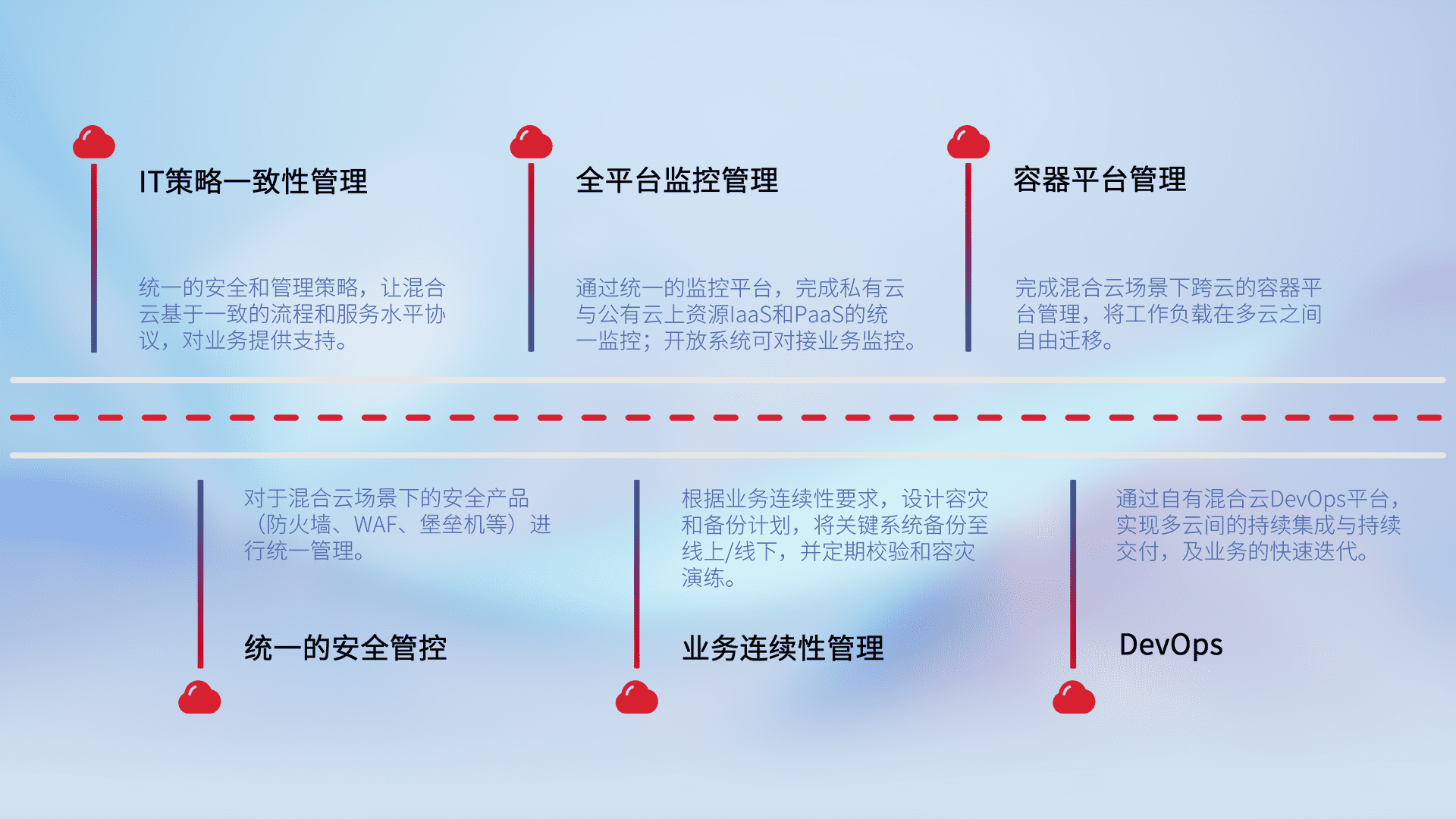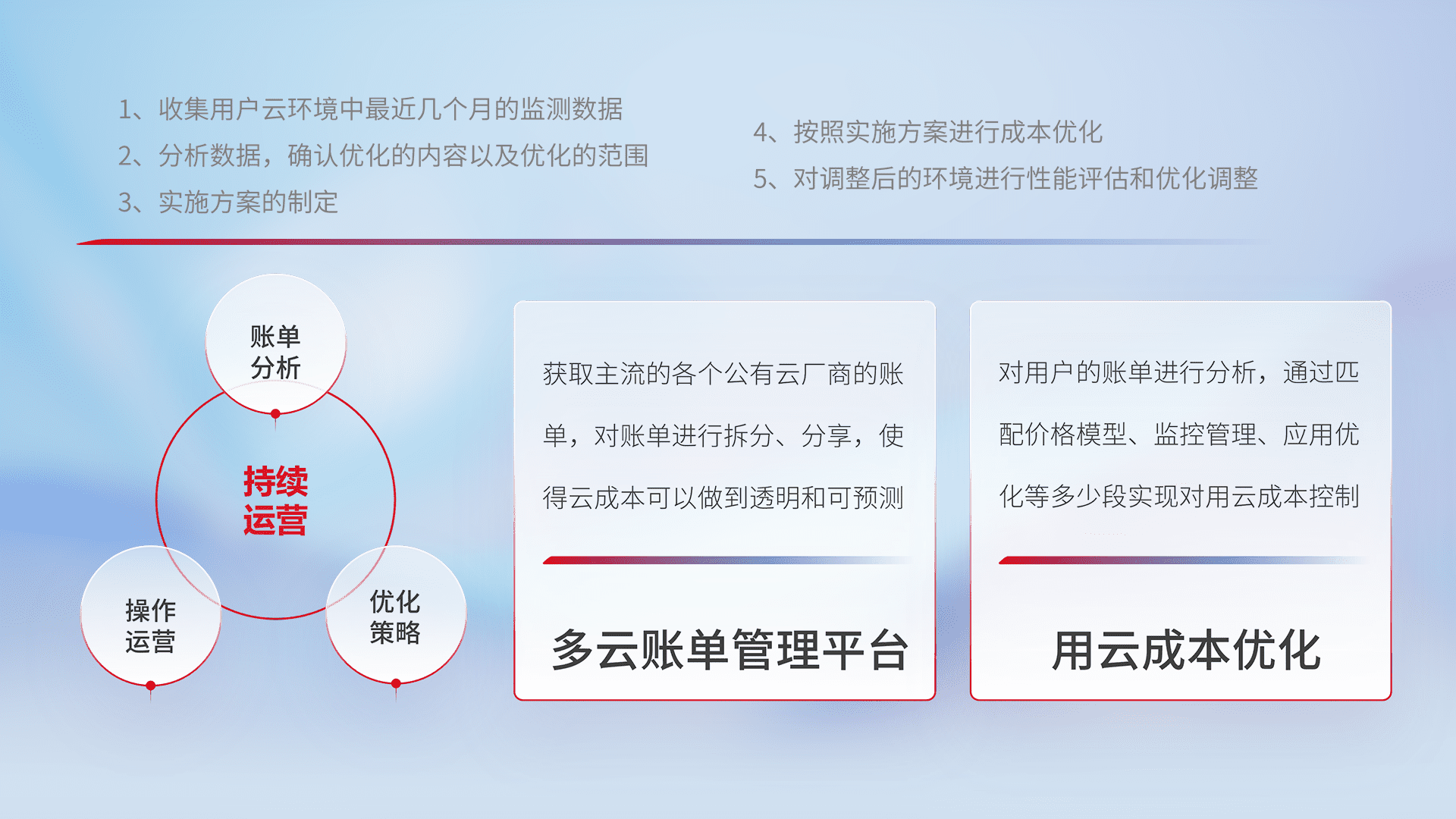 通过多云纳管,,,,以统一的资源数据模型把客户的云资源进行抽象和封装,,,进而实现对多云资源的统一操作,,保障云资源管理的可靠性、、、、稳定性与可用性。。量身定制化运维内容,,,配置、、、、开发运维、、、、补丁管理、、备份、、监控、、、、认证和访问管理、、、审计和日常巡检等,,,,保障在用云过程中的可靠度,,,,稳定度以及高可用率。。。。